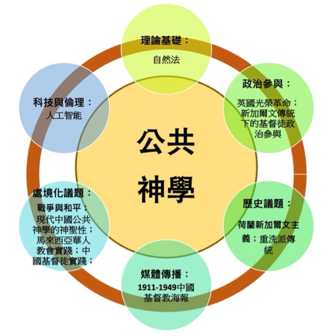 為呈現會議的內容,筆者採用圖示的方法說明:圖示二中間圓形代表公共神學會議所相關的議題,外圍大圓形則連結所有不同的領域,以幫助讀者思考各個領域之間的系統性和有機整合關係。