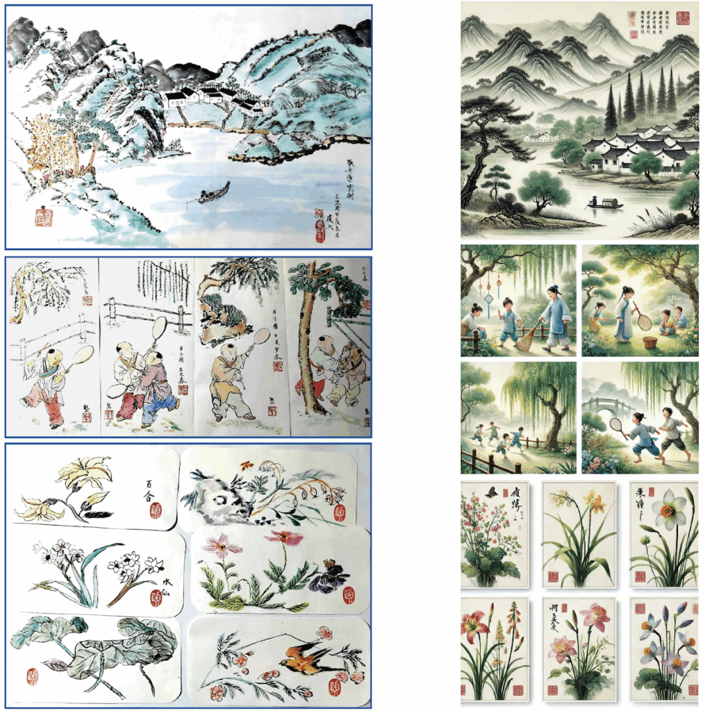 以下圖片左欄(列)是由恩福義工程志堅繪製的畫作,由上至下依次為:山水畫、百子圖、花卉圖。右欄(列)則是由ChatGPT繪圖功能所生成的相應主題圖片。